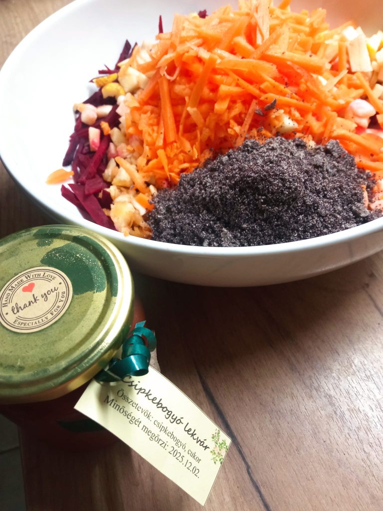 2-3 alma, 1 cékla, 2 sárgarépa, 2-5 evőkanál frissen darált mák, 4-5 evőkanál hecsedli lekvár