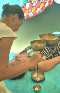 A 50-minute session is a full sound massage: first on the back of the body (from toe to head) and then on the front of the body, by vibrating the singing bowls mainly on different parts of the body – the chakras – and around the body.